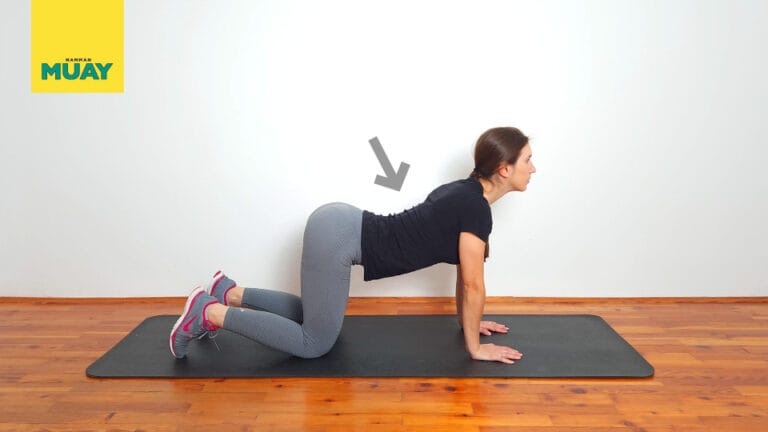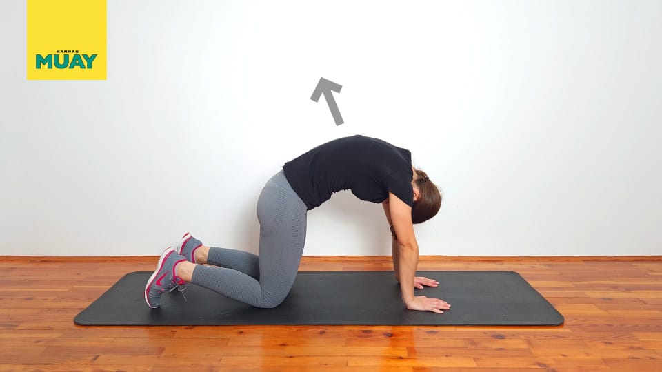 Začněte na všech čtyřech s rukama pod rameny a koleny pod kyčlemi, nadechněte se a zaoblete záda s bradou k hrudníku.